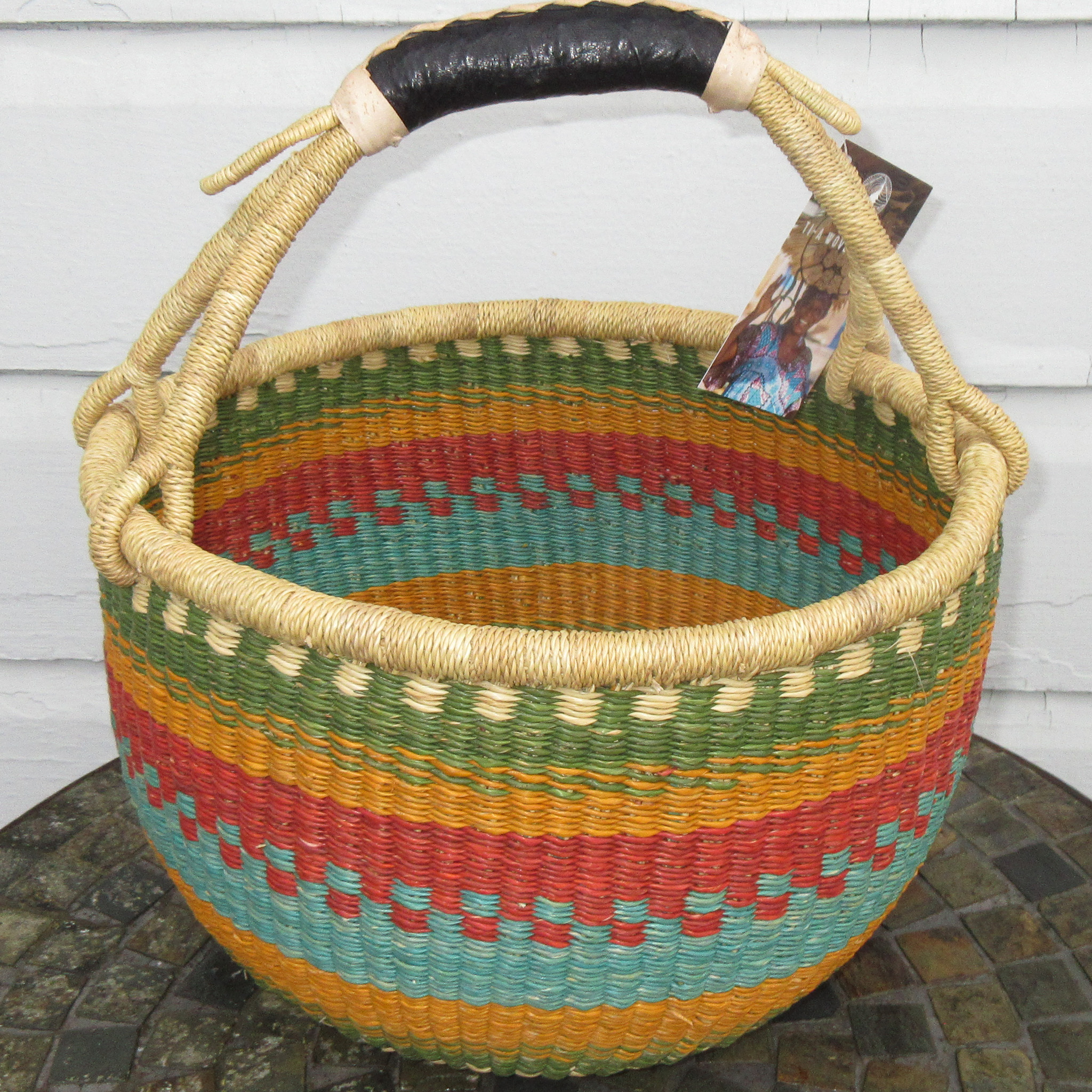 Aside from being good shopping totes, medium Bolga market baskets serve well as harvest baskets, picnic baskets, and Easter baskets. To clean or re-shape a Bolga basket, simply wet it with cool water, clean and shape it as needed, and allow it to air dry. Store it away from direct sunlight to keep the colors vivid.