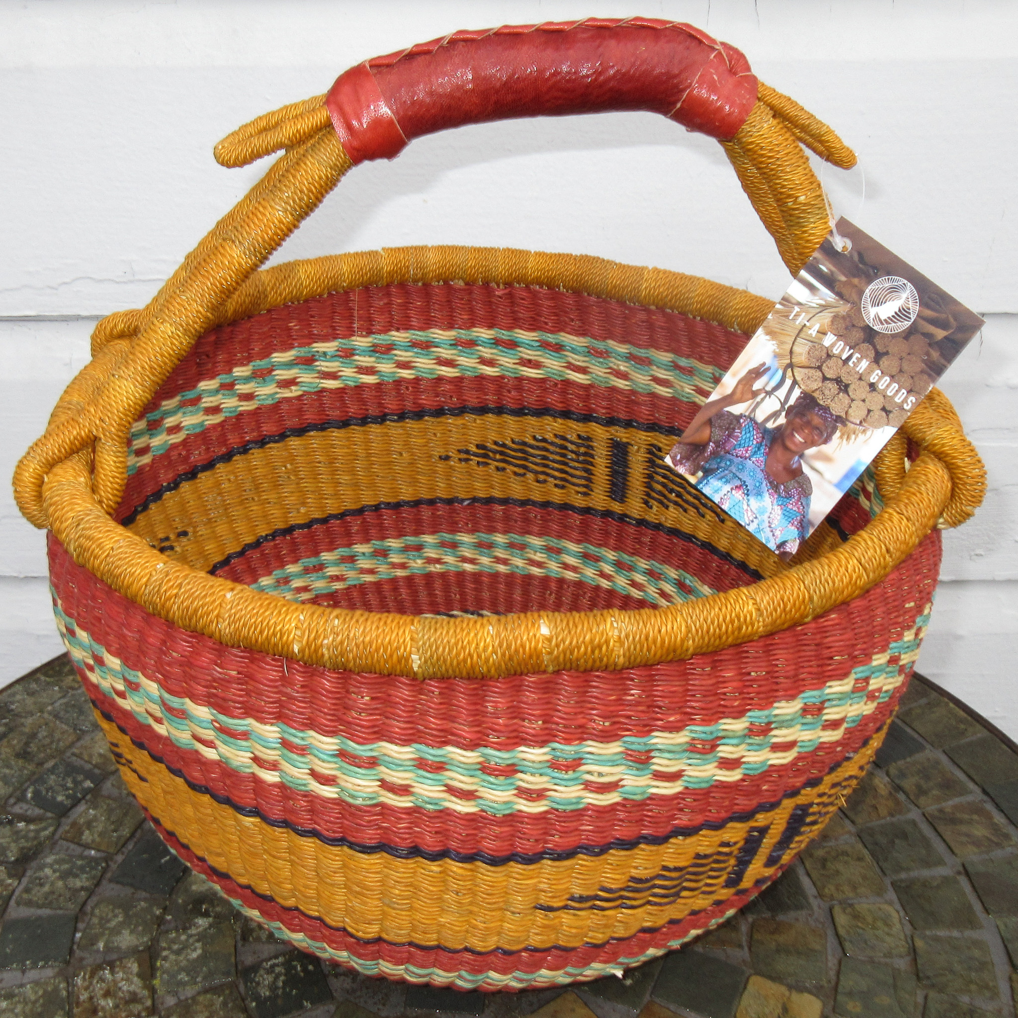 Our fair trade Bolga baskets are made in the Bolgatanga region of northern Ghana in West Africa. Bolga baskets are among the best known African baskets because of their versatility and durability. They are woven from elephant grass, which grows abundantly in the area, and the leather handles are made from local goat skin. The basket export industry is a critical source of income for the weavers, especially when harvests are poor. Bolga baskets are also sustainable products, and their production has a minimal impact on the environment. Last but not least, buying an African basket helps traditional craftsmanship to flourish.
