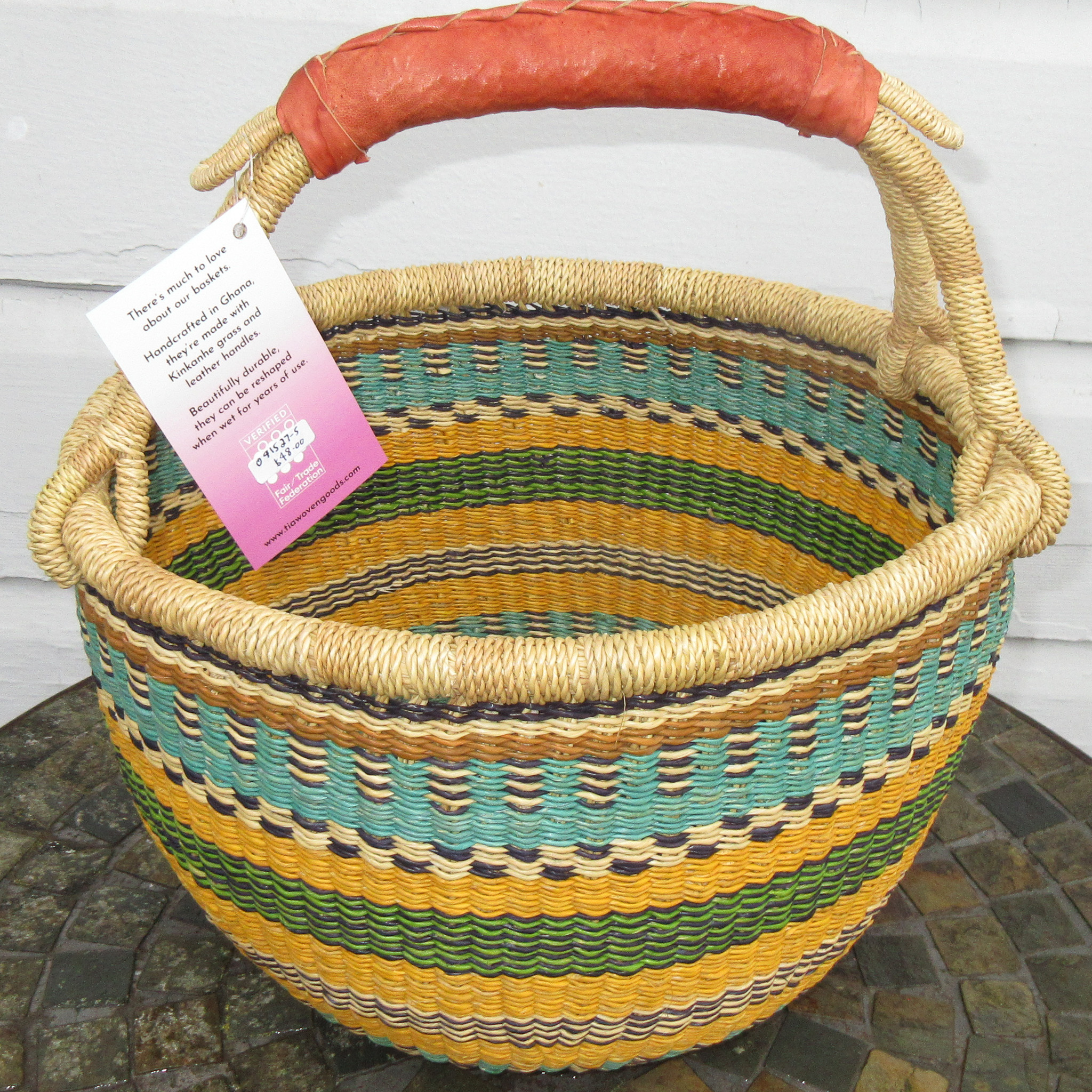 Aside from being good shopping totes, medium Bolga market baskets serve well as harvest baskets, picnic baskets, and Easter baskets. To clean or re-shape a Bolga basket, simply wet it with cool water, clean and shape it as needed, and allow it to air dry. Store it away from direct sunlight to keep the colors vivid.