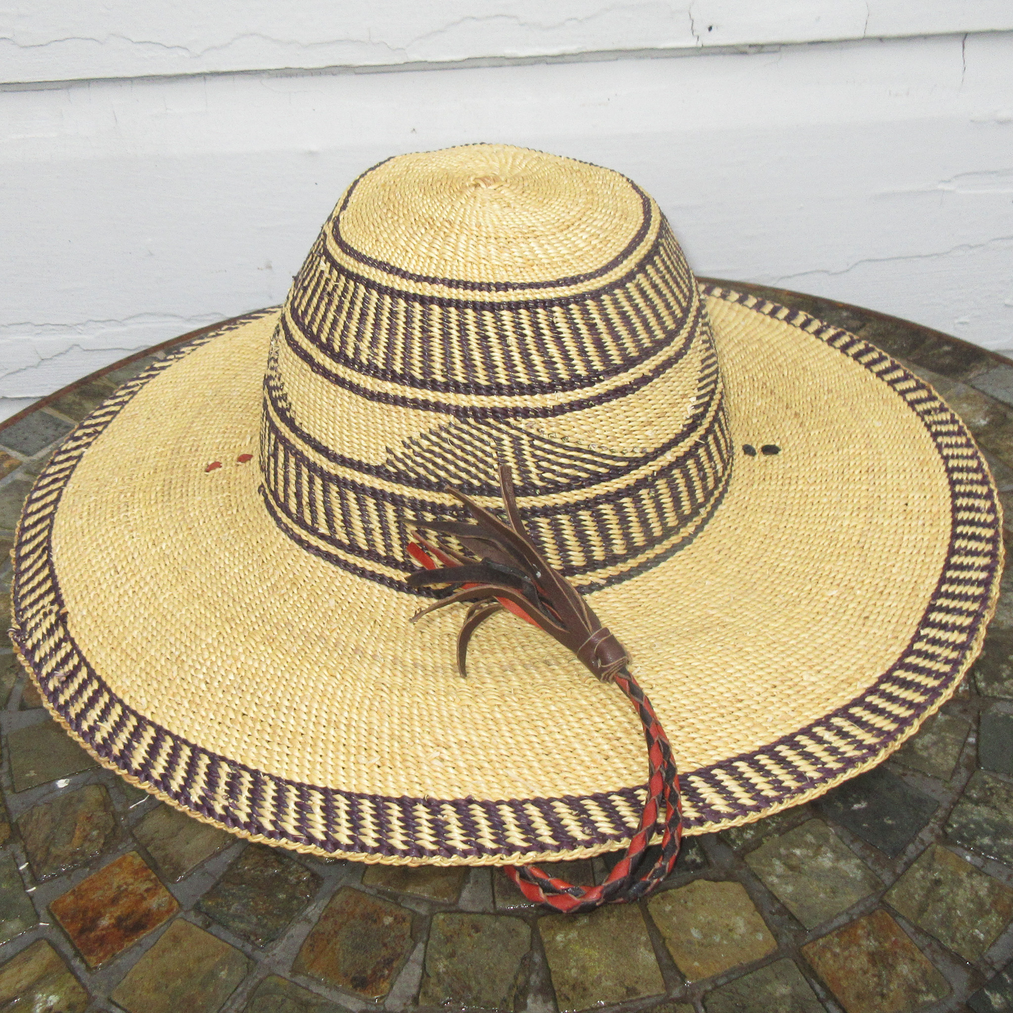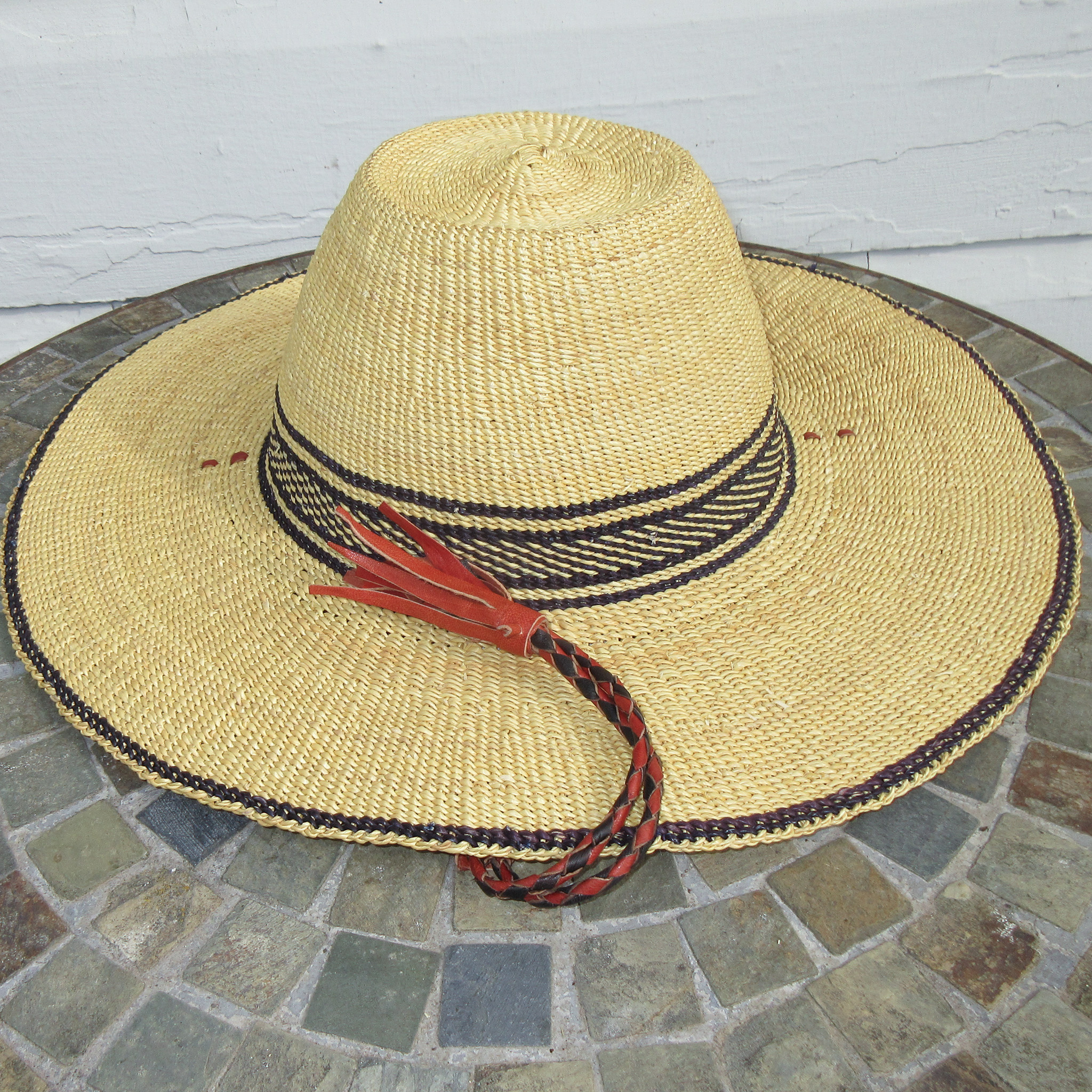 This extra large, wide brimmed African straw hat is both beautiful and practical. Tightly woven with a stiff brim, it is a durable sun hat. It has a braided leather adjustable chin strap, will fit a 23.5"-24.5" circumference head and the brim is 16.5" across. Handmade from elephant grass and goatskin in the Bolgatanga region of Ghana, and sometimes referred to as a Bolga hat.