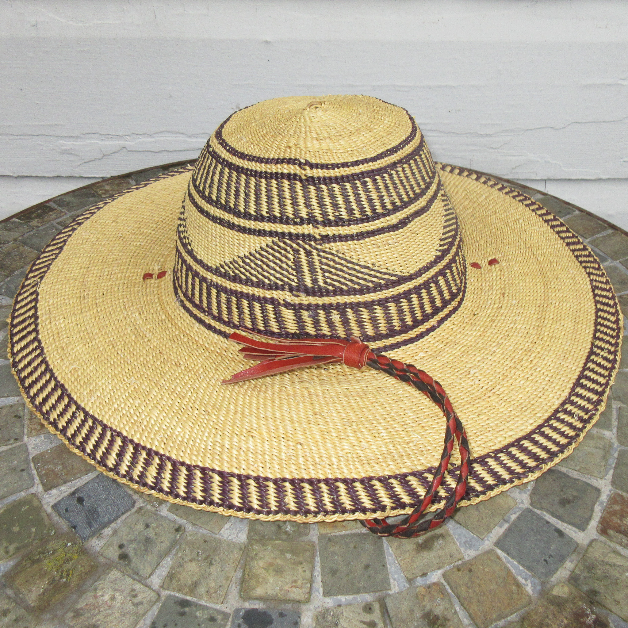 This extra large African straw hat is both beautiful and practical. Tightly woven and stiff-brimmed, it is a durable sun hat. It has a braided leather adjustable chin strap, will fit a 23.5"-24.5" circumference head and the brim is 16.5" wide. Handmade from elephant grass and goatskin in the Bolgatanga region of Ghana, and sometimes referred to as a Bolga hat.