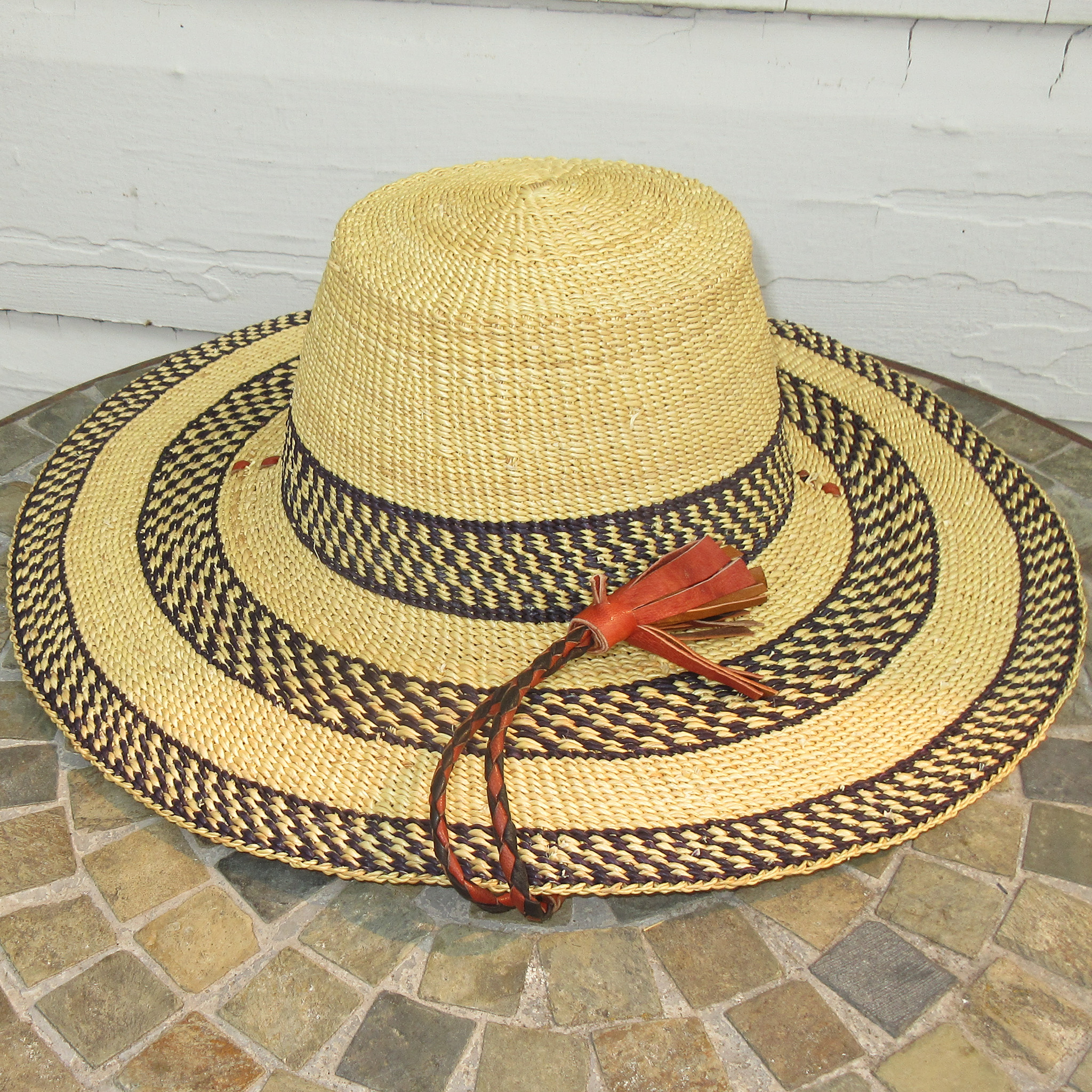 This fair trade West African straw hat is both beautiful and practical. Tightly woven with a stiff brim, it makes an excellent sun hat. It has a braided leather adjustable chin strap, will fit a 22.5"-23.5" circumference head, and has a 16" wide brim. Handmade from elephant grass and goatskin in the Bolgatanga region of Ghana, and sometimes referred to as a Bolga hat.
