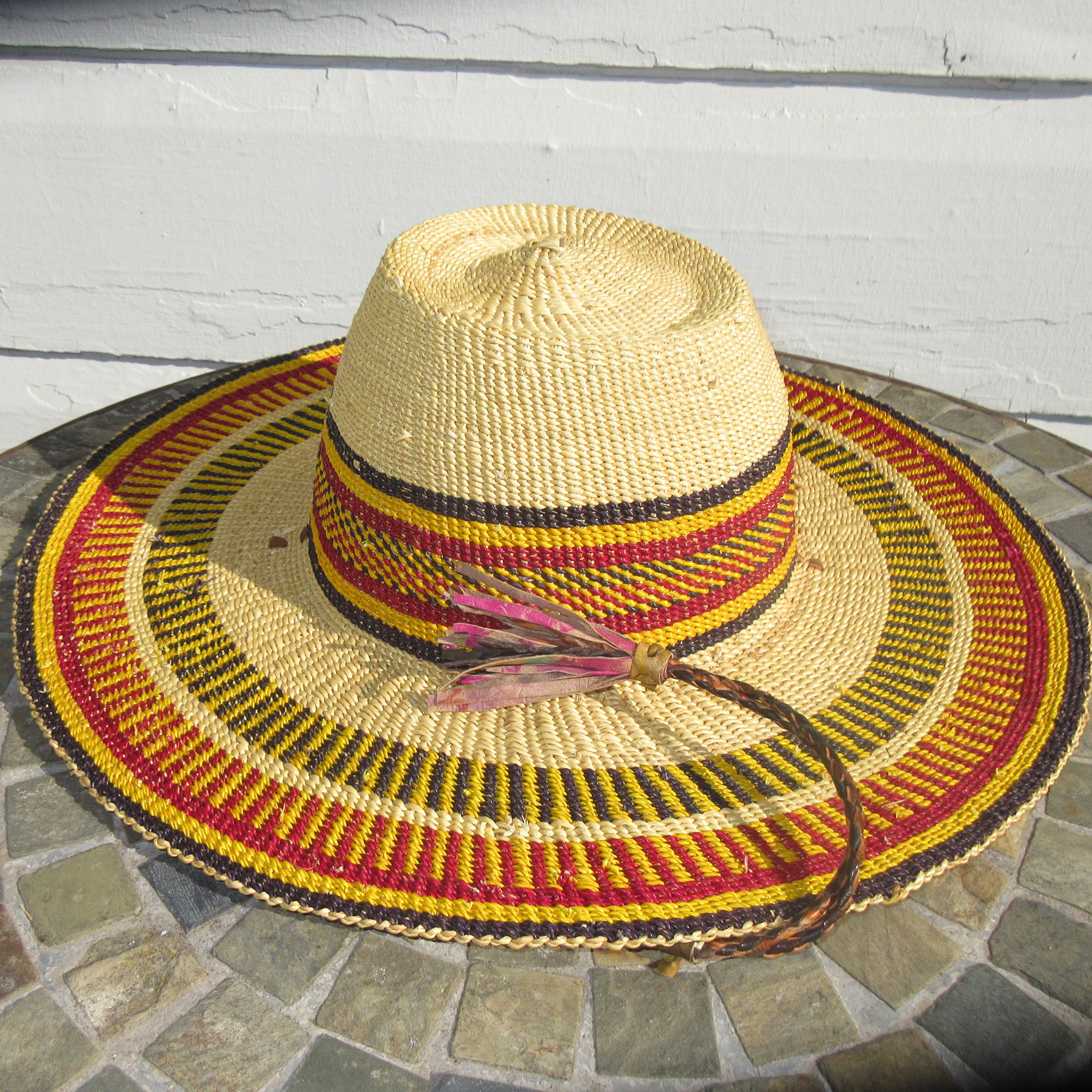 This fair trade West African straw hat is both beautiful and durable. Tightly woven and stiff-brimmed, it is an excellent sun hat. It has a braided leather adjustable chin strap, fits a 22.5"-23.5" circumference head, and has a 16.5" wide brim. Handmade from elephant grass and goatskin in the Bolgatanga region of Ghana, and sometimes referred to as a Bolga hat.