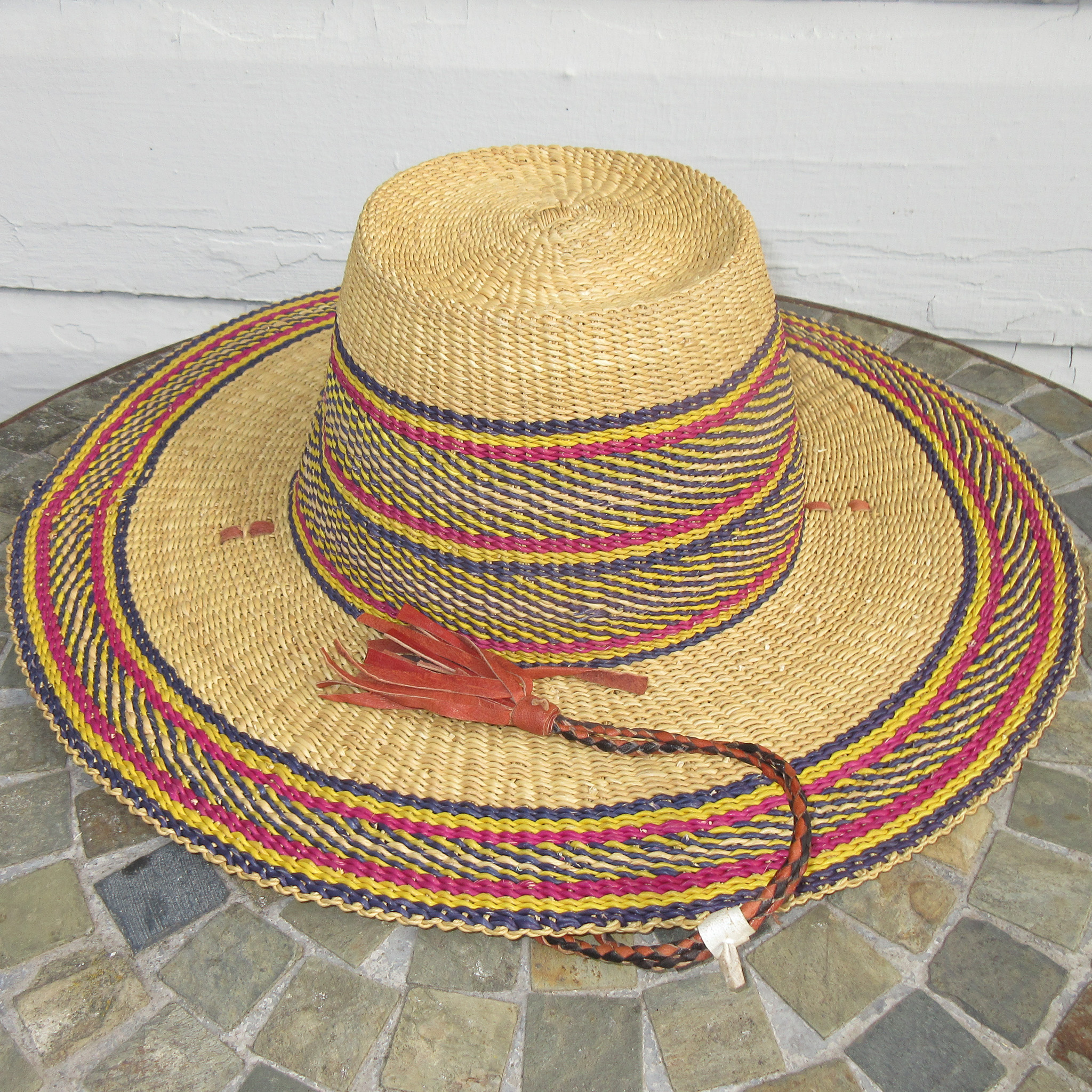 This wide-brimmed, unlined, unisex West African straw hat is both beautiful and useful. Tightly woven and stiff-brimmed, it makes an excellent sun hat. It has a braided leather adjustable chin strap, will fit a 23"-24" circumference head, and has a 16" wide brim. It is handmade from elephant grass in the Bolgatanga region of Ghana, and is sometimes referred to as a Bolga hat. Make sure to measure your head before ordering.