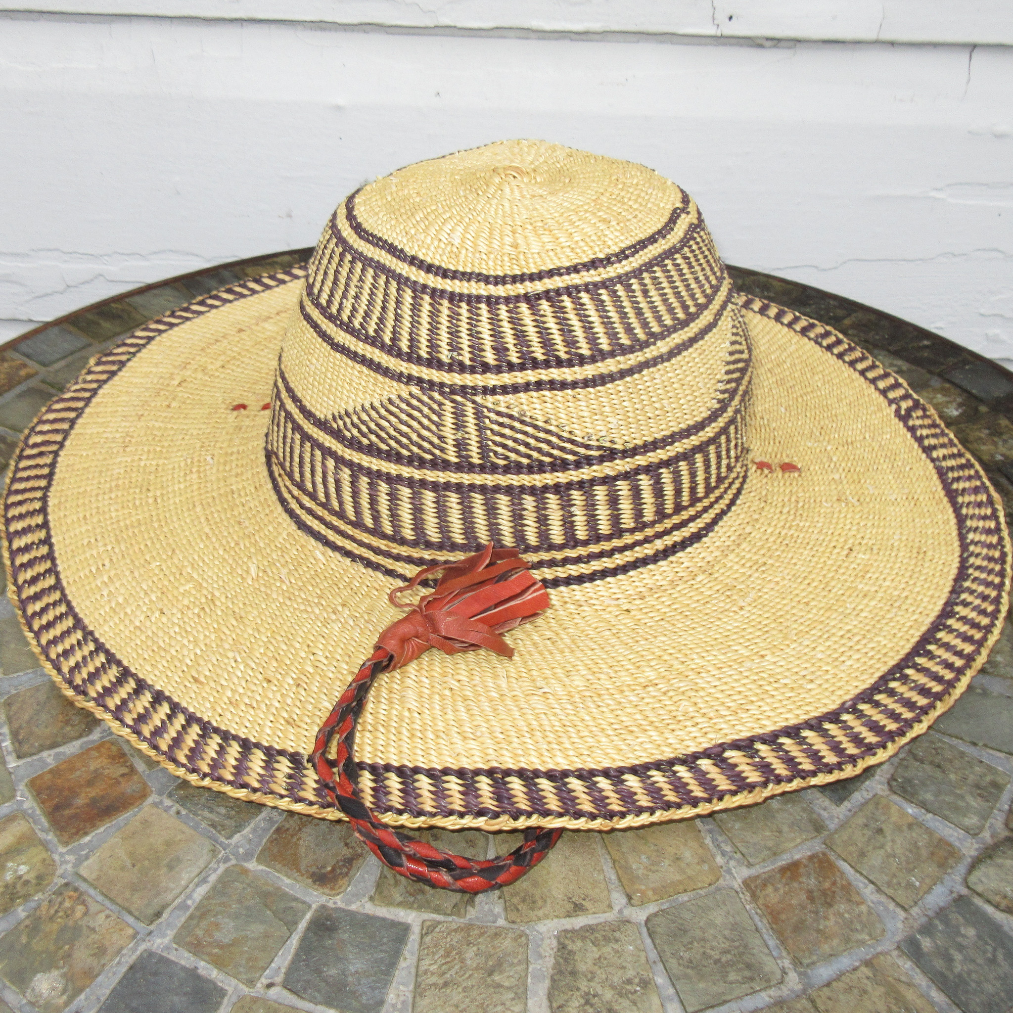 This extra-extra-large West African straw hat is both beautiful and useful. Tightly woven and stiff-brimmed, it is an excellent sun hat. It has a braided leather adjustable goatskin chin strap, will fit a 24"-25" circumference head, and has a 16.25" wide brim. Handmade in the Bolgatanga region of Ghana, from elephant grass, and sometimes referred to as a Bolga hat. This is an unusually large hat, be sure you know your head size before ordering.