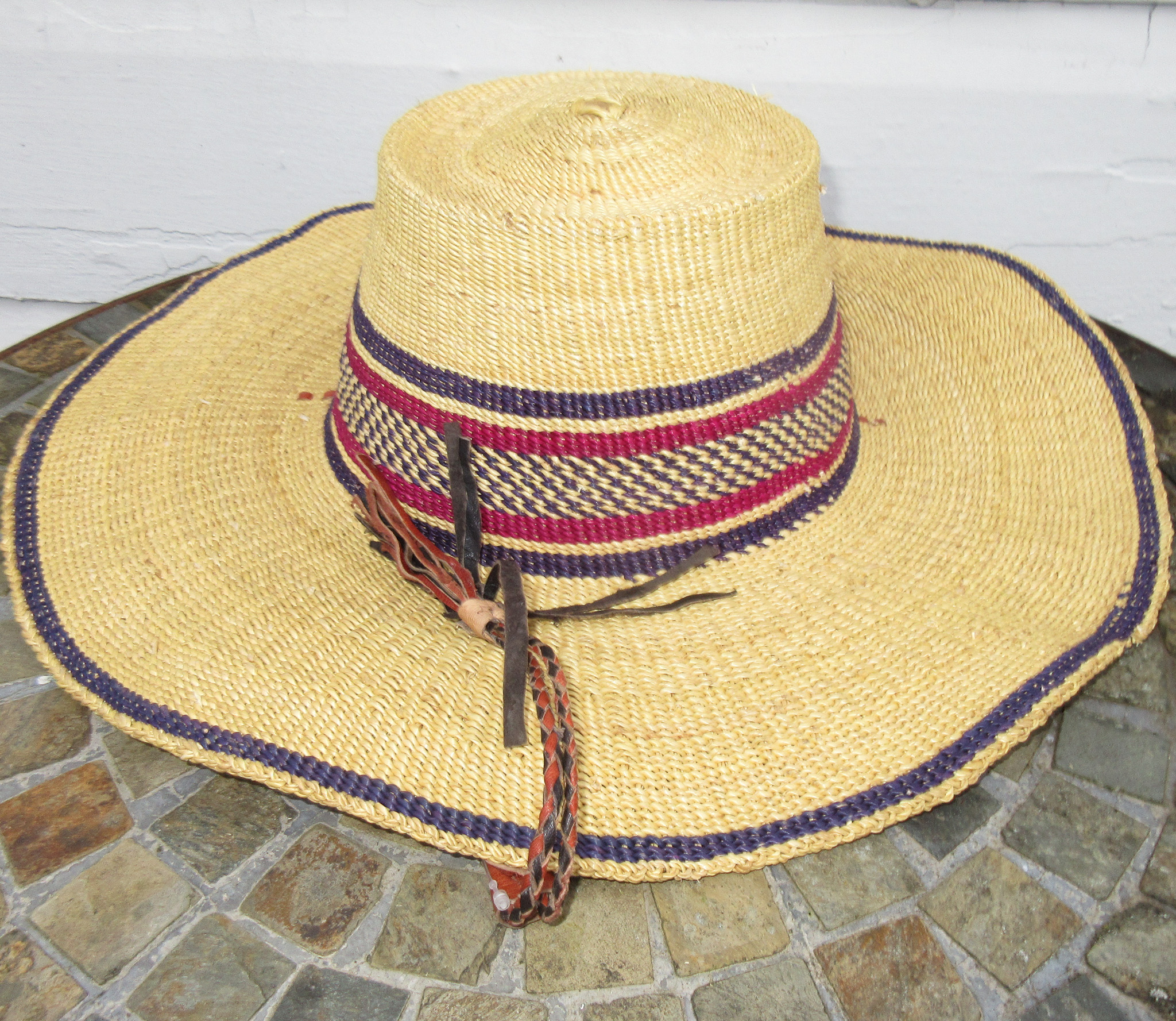 ***Discounted due to wavy brim.*** This extra large West African straw hat is both beautiful and useful. Tightly woven and stiff-brimmed, it is an excellent sun hat. It has a braided leather adjustable chin strap, will fit a 24"-25" circumference head, and has a 17.5" wide brim. It is handmade in the Bolgatanga region of Ghana, and is sometimes referred to as a Bolga hat. This is a very large hat, please check your head size before ordering.