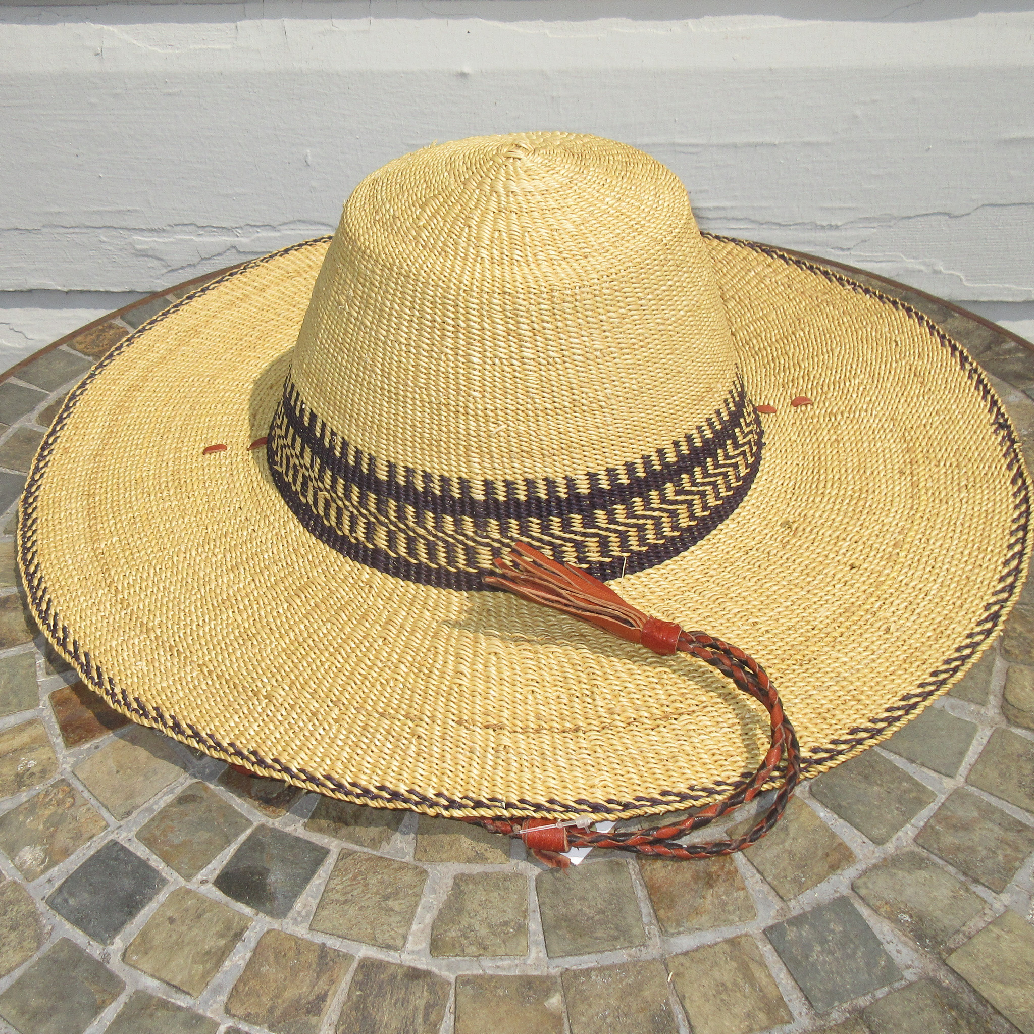 Not for the small of head! This XXXL African straw hat big and beautiful. Tightly woven and stiff-brimmed, it is a durable sun hat. It has a braided leather adjustable chin strap. It will fit a 24.5"-25.5" circumference head and the brim is 17.75" wide. Handmade from elephant grass and goatskin in the Bolgatanga region of Ghana, and sometimes referred to as a Bolga hat.