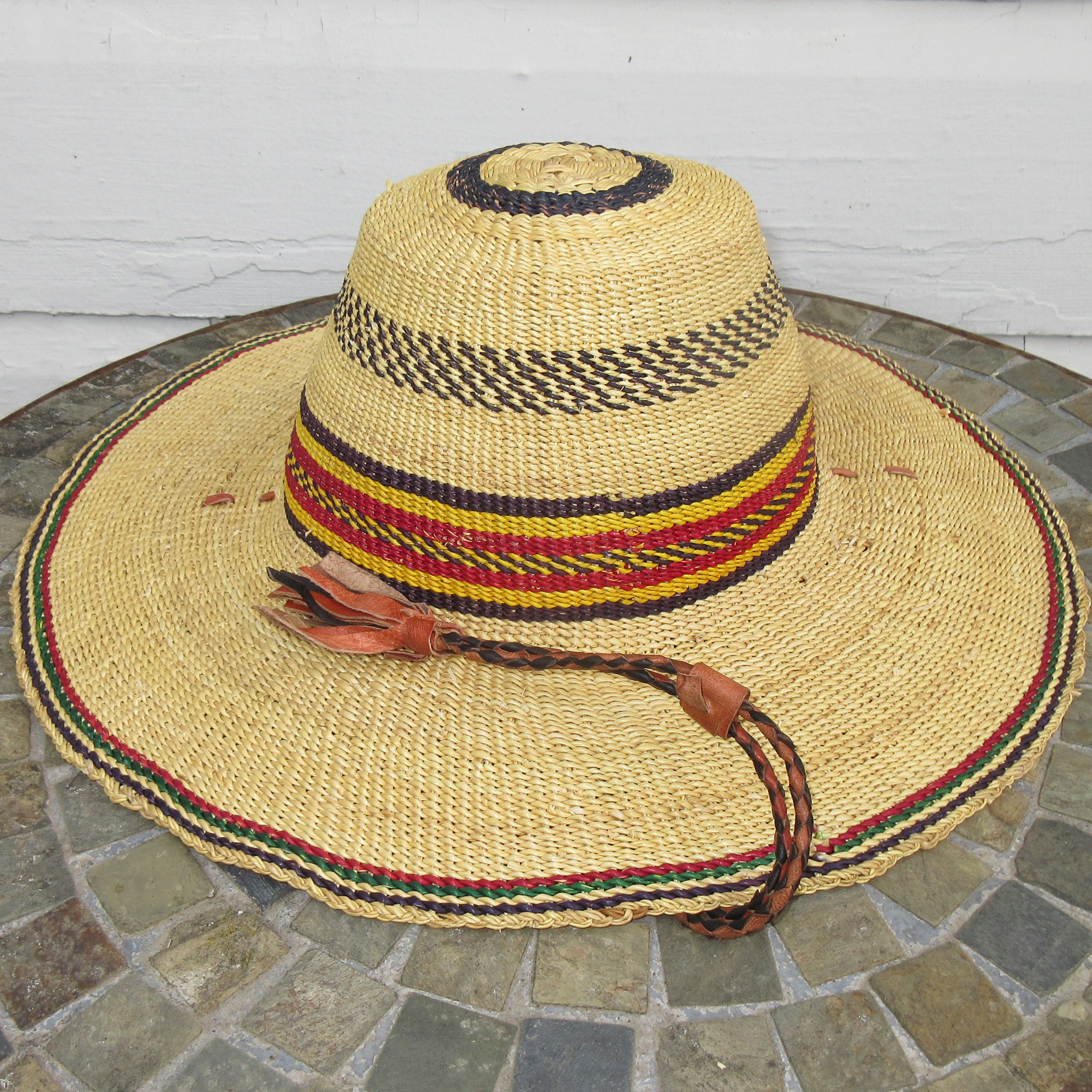 This large, natural colored fair trade West African straw hat is both beautiful and useful. Tightly woven and stiff brimmed, it is an excellent sun hat. It has a braided leather adjustable chin strap, will fit a 23"-24" circumference head, and has a 16" wide brim. Handmade in the Bolgatanga region of Ghana, and sometimes referred to as a Bolga hat.