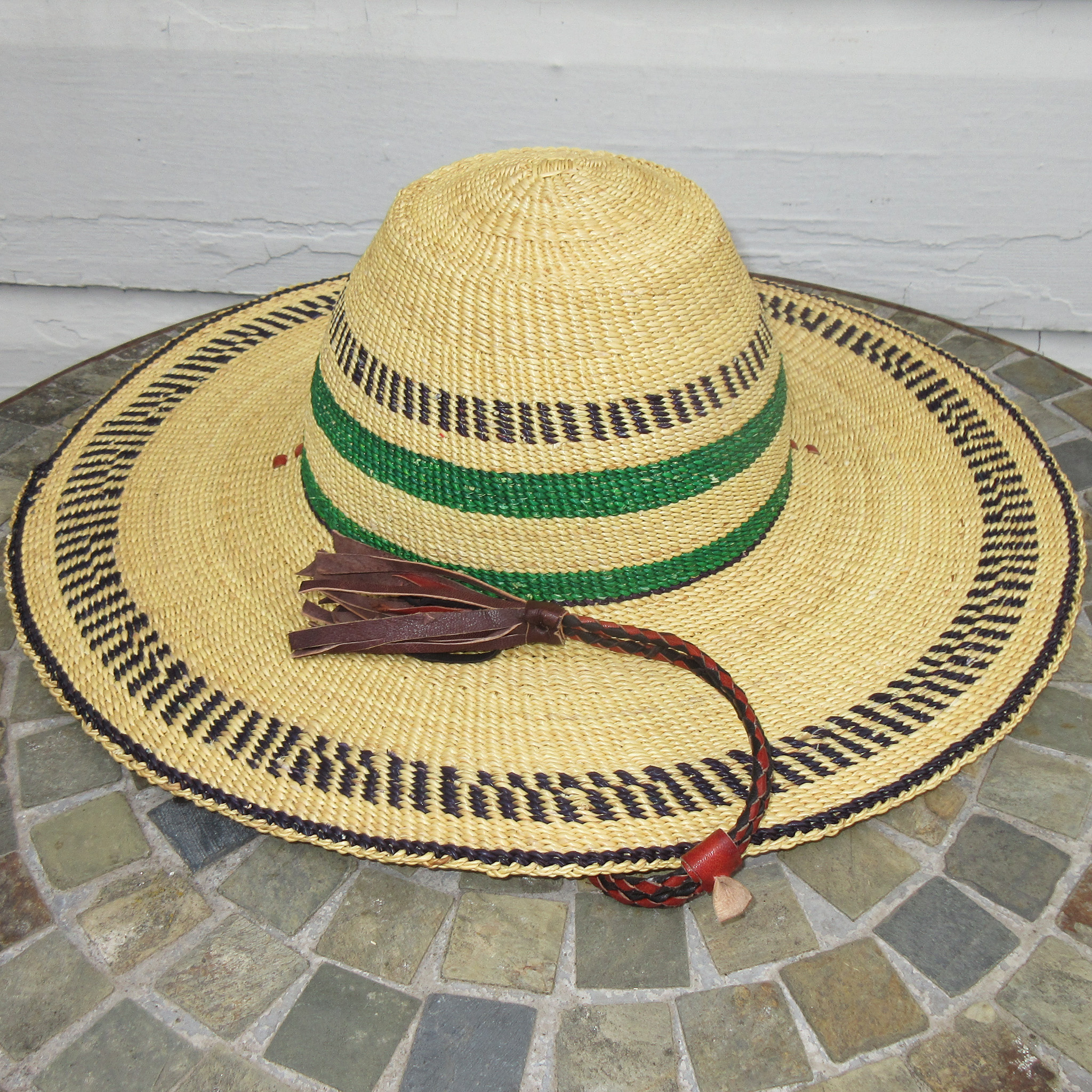 This African straw hat is both beautiful and practical. Tightly woven and stiff-brimmed, it makes an excellent sun hat. It stays put with a braided leather adjustable chin strap. The crown will fit a 22.5"-23.5" head. It has a 17" wide brim, and was handmade from elephant grass and goatskin in the Bolgatanga region of Ghana, and sometimes referred to as a Bolga hat.