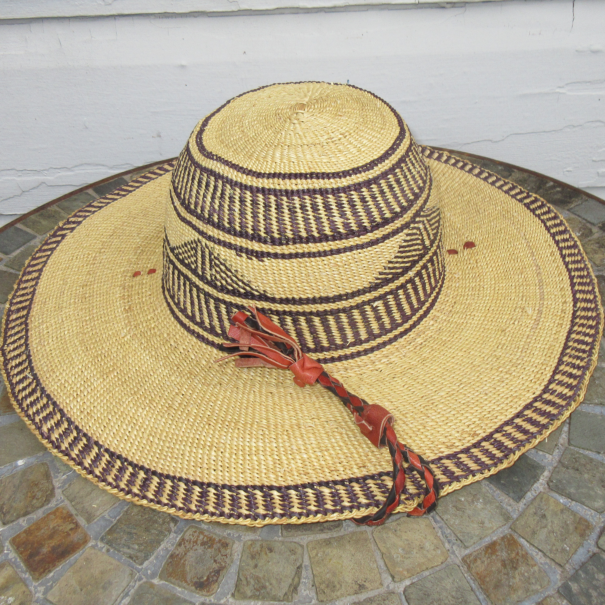 This unisex fair trade West African straw hat is both beautiful and useful. Tightly woven and broad-brimmed, it makes an excellent sun hat. It has a braided leather adjustable chin strap, will fit a 23"-24" circumference head, and has a stiff 16.25" wide brim. It is handmade in the Bolgatanga region of Ghana, and is sometimes referred to as a Bolga hat. Please check your head size before ordering.
