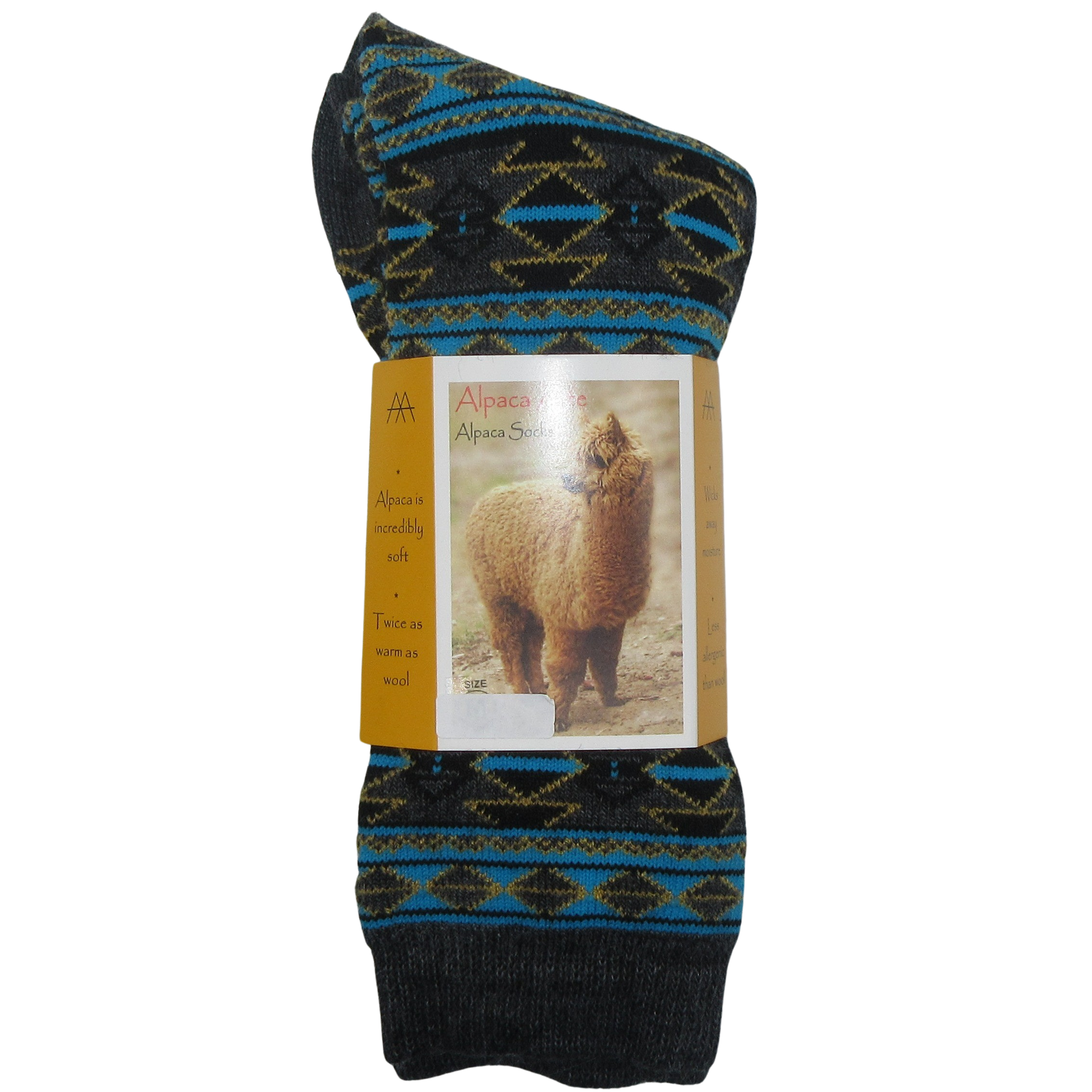 These mid-weight alpaca socks have a turquoise, gray, and gold Aztec design. Our crew length breathable, moisture repelling alpaca socks help prevent blisters and are anti-microbial. Alpaca fiber offers breathable insulation, does not absorb much moisture, and it is naturally anti-fungal. These mid-weight alpaca socks are durable, luxurious and soft. Sustainably made from 41% alpaca, 34% acrylic, 23% nylon and 2% spandex. Machine wash cold and tumble dry low. Made in Peru.