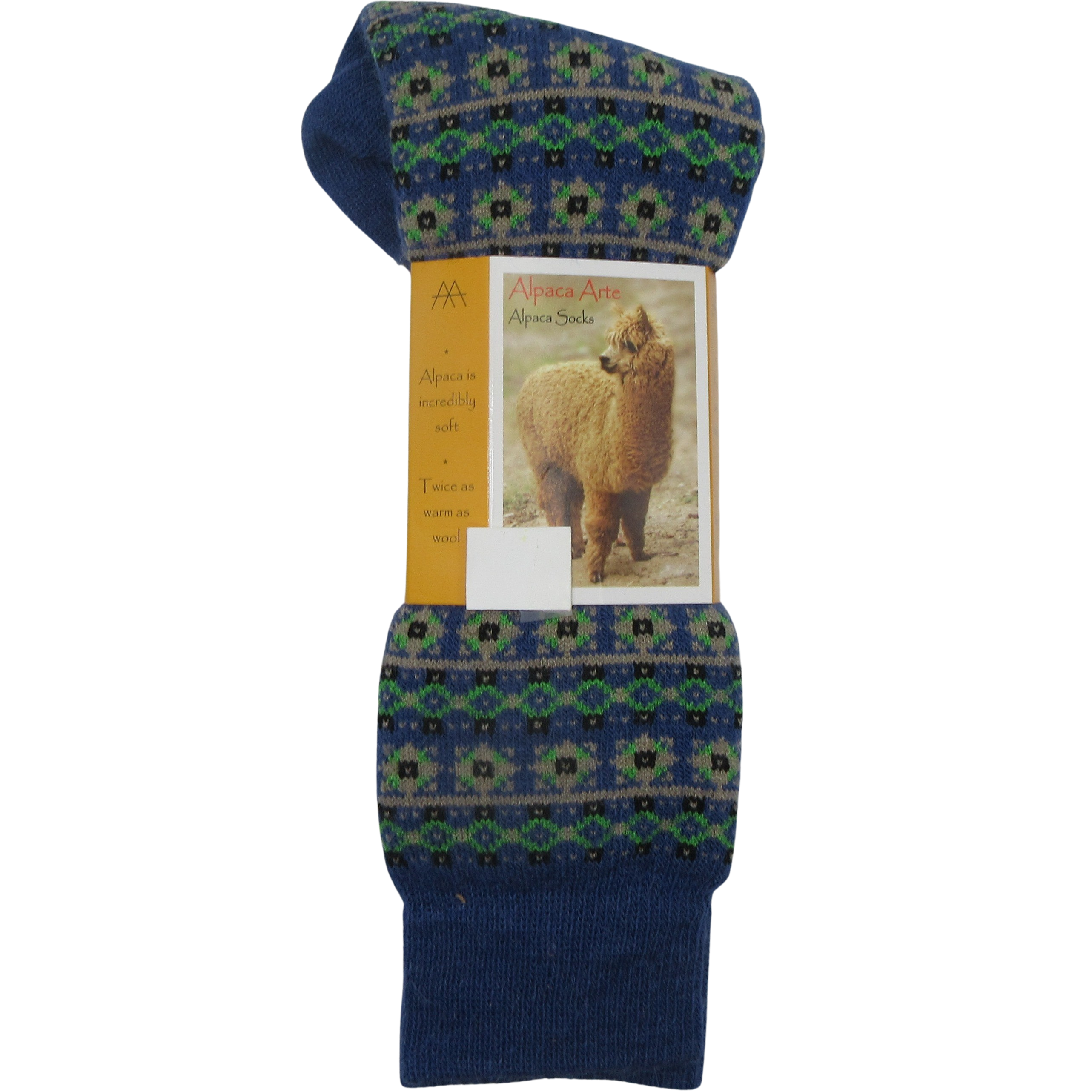 These mid-weight Baltic alpaca socks are blue, green, black, and cream. Great trouser socks. Our crew length breathable, moisture repelling alpaca socks help prevent blisters and are anti-microbial. Because alpaca is strong and durable, it offers breathable insulation, does not absorb much moisture, and it is naturally anti-fungal. Durable, luxurious feel, mid-weight, and sustainably made from 41% Alpaca, 34% Acrylic, 23% Nylon and 2% Spandex. Machine wash cold and tumble dry low. Made in Peru.