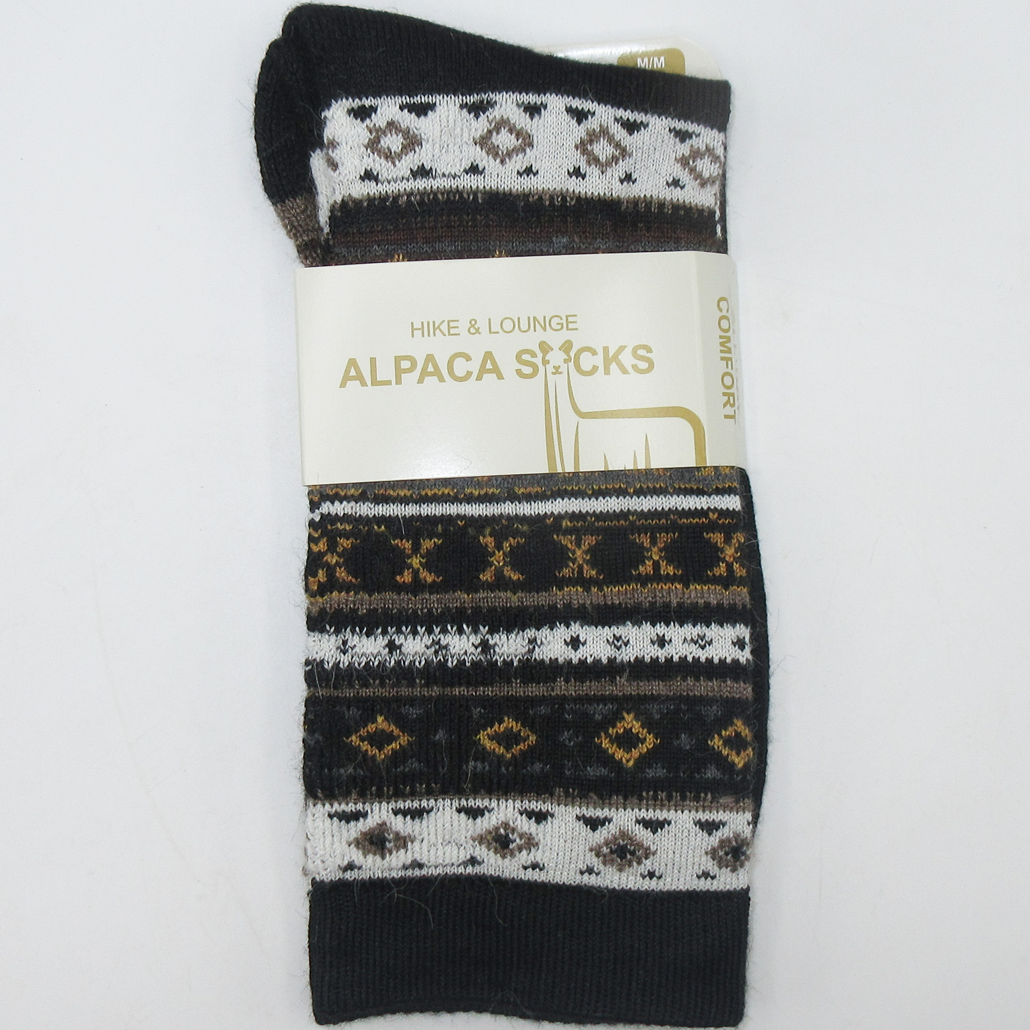 These Elegant Black alpaca socks are striped in a black, white, brown, gray, and gold. Our crew length, light cushioned, breathable, moisture repelling alpaca socks help prevent blisters and are anti-microbial. These socks have cushion along the footbed, with minimal cushion on top of the foot. Alpaca fiber is strong and soft, offers breathable insulation, absorbs minimal moisture, and it is naturally anti-fungal. Durable, luxurious feel, and sustainably made from 70% Alpaca Fiber, 15% Acrylic, 8% Spandex, 7% Nylon. Machine wash cold and tumble dry low. Fair Trade Certified. Made in Peru.