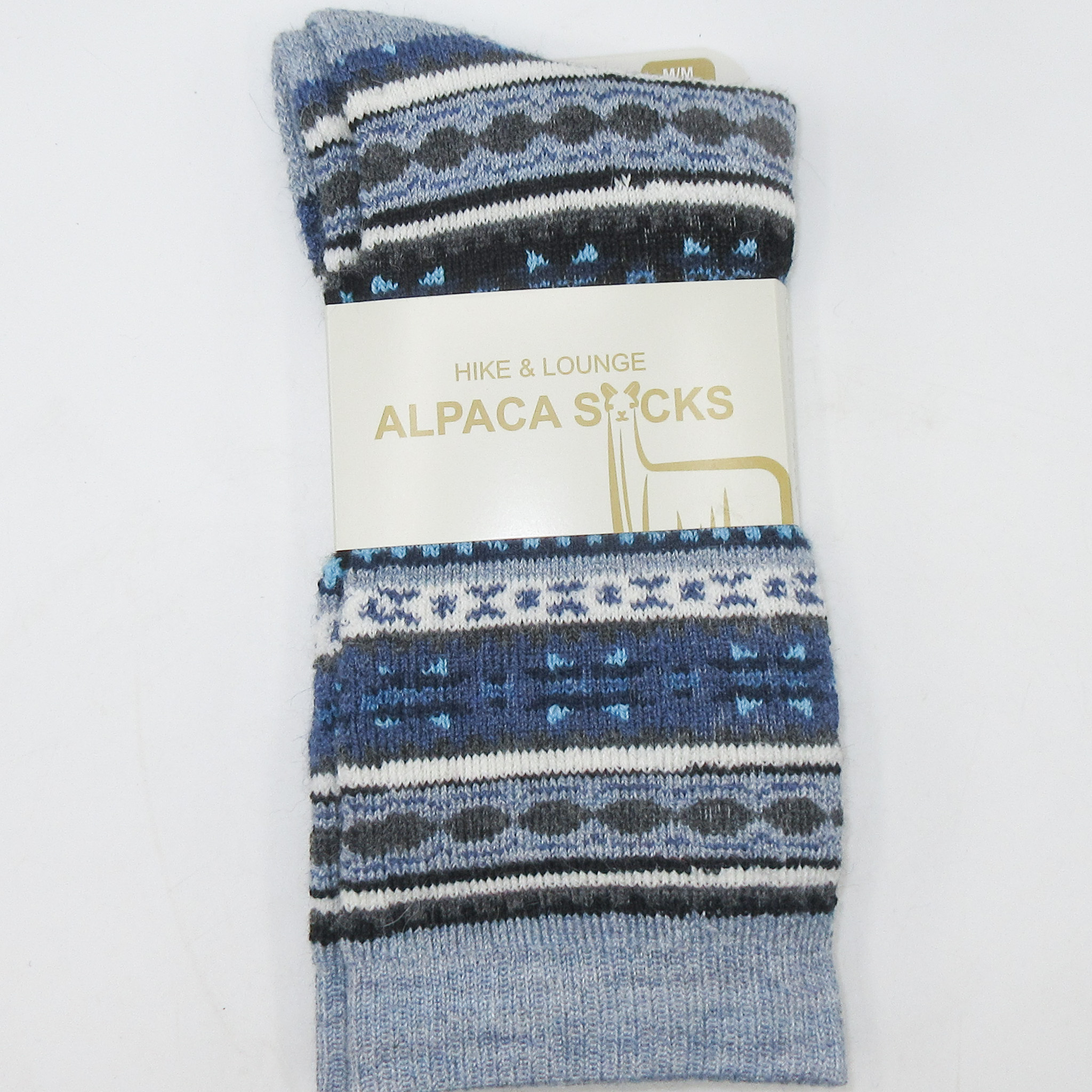 These Fair Isle Gray alpaca socks are striped in a gray, blue, and white design. Our crew length, full cushioned, breathable, moisture repelling alpaca socks help prevent blisters and are anti-microbial. These socks have cushion along the footbed, with cushion on top of the foot. Alpaca fiber is strong and soft, offers breathable insulation, absorbs minimal moisture, and it is naturally anti-fungal. Durable, luxurious feel, and sustainably made from 70% Alpaca Fiber, 15% Acrylic, 8% Spandex, 7% Nylon. Machine wash cold and tumble dry low. Fair Trade Certified. Made in Peru.