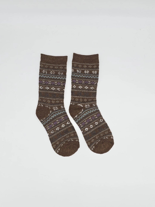 These Faire Isle Brown alpaca socks are striped in a brown, white, purple, turquoise, and gray design. Our crew length, full cushioned, breathable, moisture repelling alpaca socks help prevent blisters and are anti-microbial. These socks have cushion along the footbed, with cushion on top of the foot. Alpaca fiber is strong and soft, offers breathable insulation, absorbs minimal moisture, and it is naturally anti-fungal. Durable, luxurious feel, and sustainably made from 70% Alpaca Fiber, 15% Acrylic, 8% Spandex, 7% Nylon. Machine wash cold and tumble dry low. Fair Trade Certified. Made in Peru.