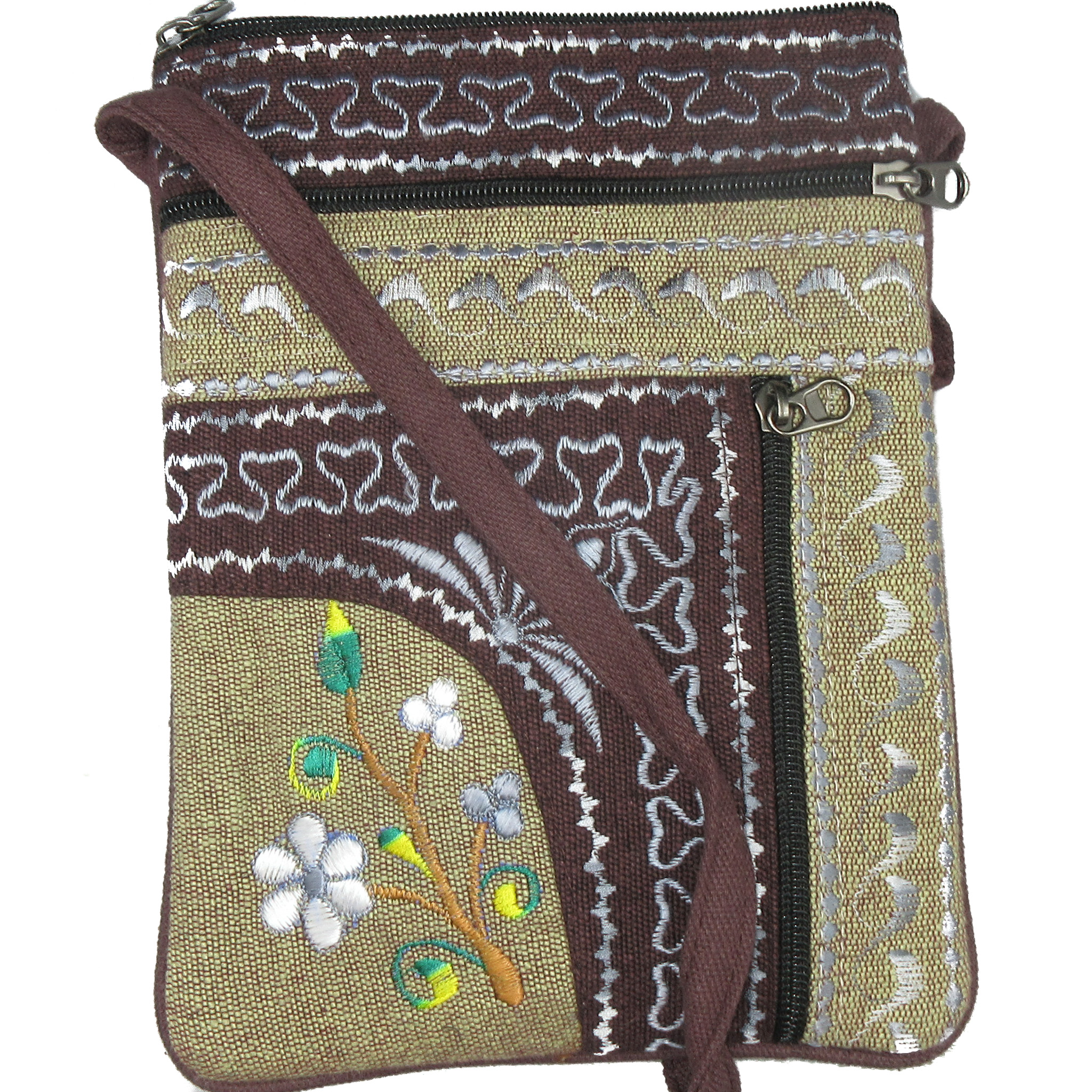 This beautiful embroidered cotton passport bag is a fair trade product of Nepal. It is tan and brown with silver and white embroidery on the front, and is about 10" x 7" with a 48" long shoulder strap (long enough to wear across your body, or you can tie a knot in it if you wish to shorten it.) It zips at the top and has three additional zippered pockets. It is one of a kind and if you order it you'll receive the exact one in the image.
