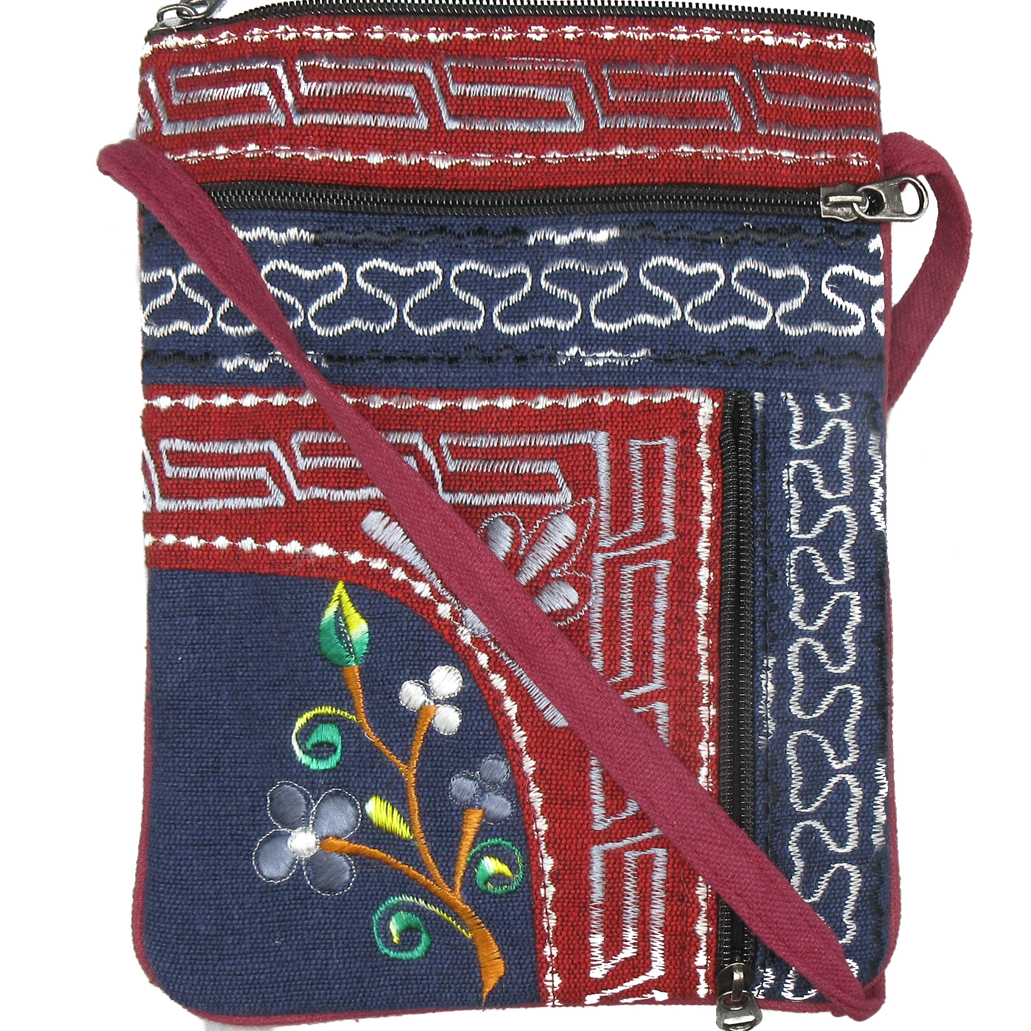 This beautiful and durable embroidered cotton passport bag is a fair trade product of Nepal. It is red and navy with silver and white embroidery on the front, and is about 10" x 7" with a 48" long shoulder strap (long enough to wear across your body, or you can tie a knot in it if you wish to shorten it.) It zips at the top and has three additional zippered pockets. It is one of a kind and if you order it you'll receive the exact one in the image.