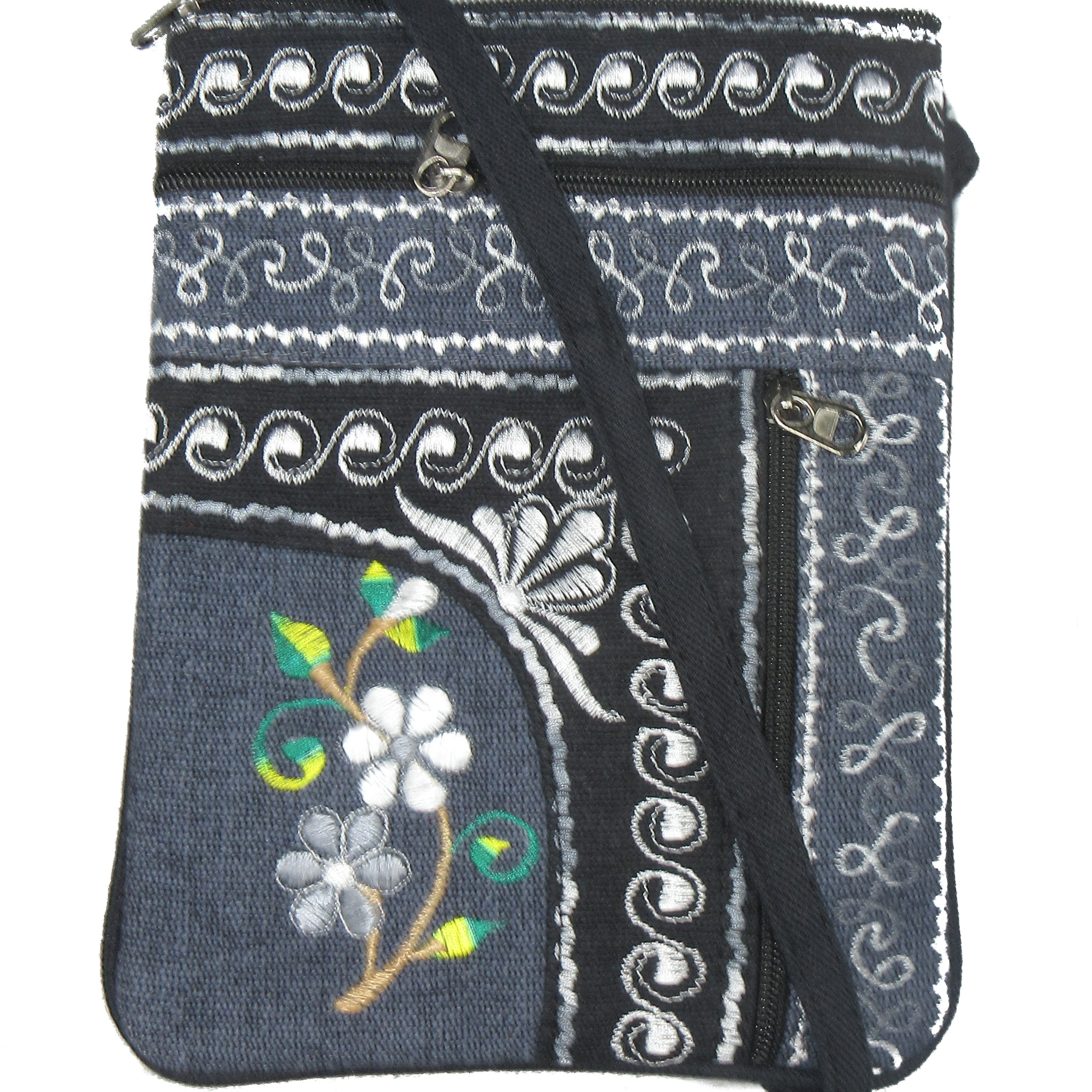 This gorgeous and practical embroidered cotton passport bag is a fair trade product of Nepal. It is gray and black with white embroidery on the front, and is about 10" x 7" with a 48" long shoulder strap (long enough to wear across your body, or you can tie a knot in it to shorten it.) It zips at the top and has three additional zippered pockets. It is unique and if you order it you'll receive the exact one in the image.