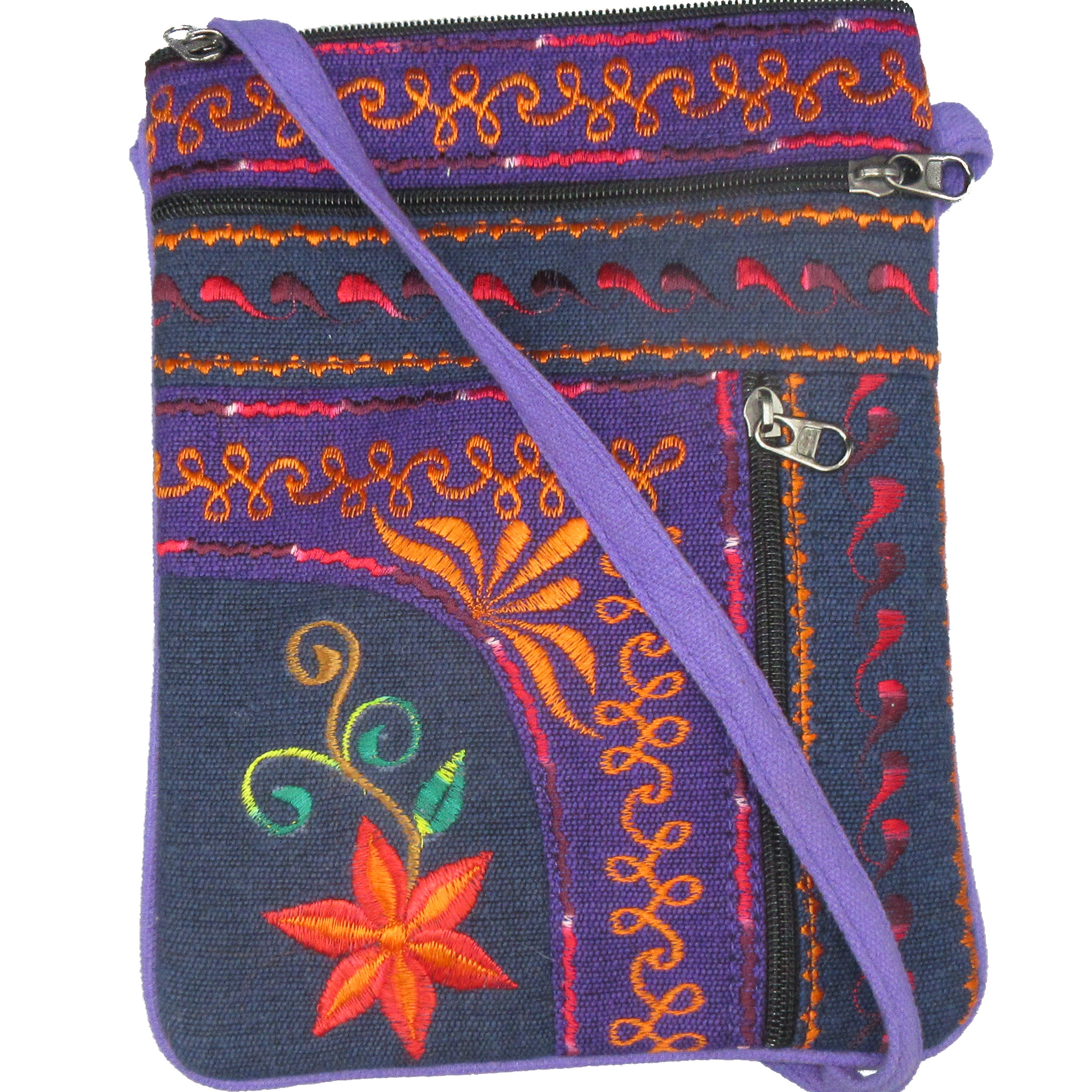 This beautiful embroidered cotton passport bag is a fair trade product of Nepal. It is navy and purple with red and orange jari embroidery on the front. This durable purse is about 10" x 7" with a 48" long shoulder strap (long enough to wear across your body, or you can tie a knot in it to shorten it.) It zips at the top and has three additional zippered pockets. It is unique and if you order it you'll receive the exact one in the image.