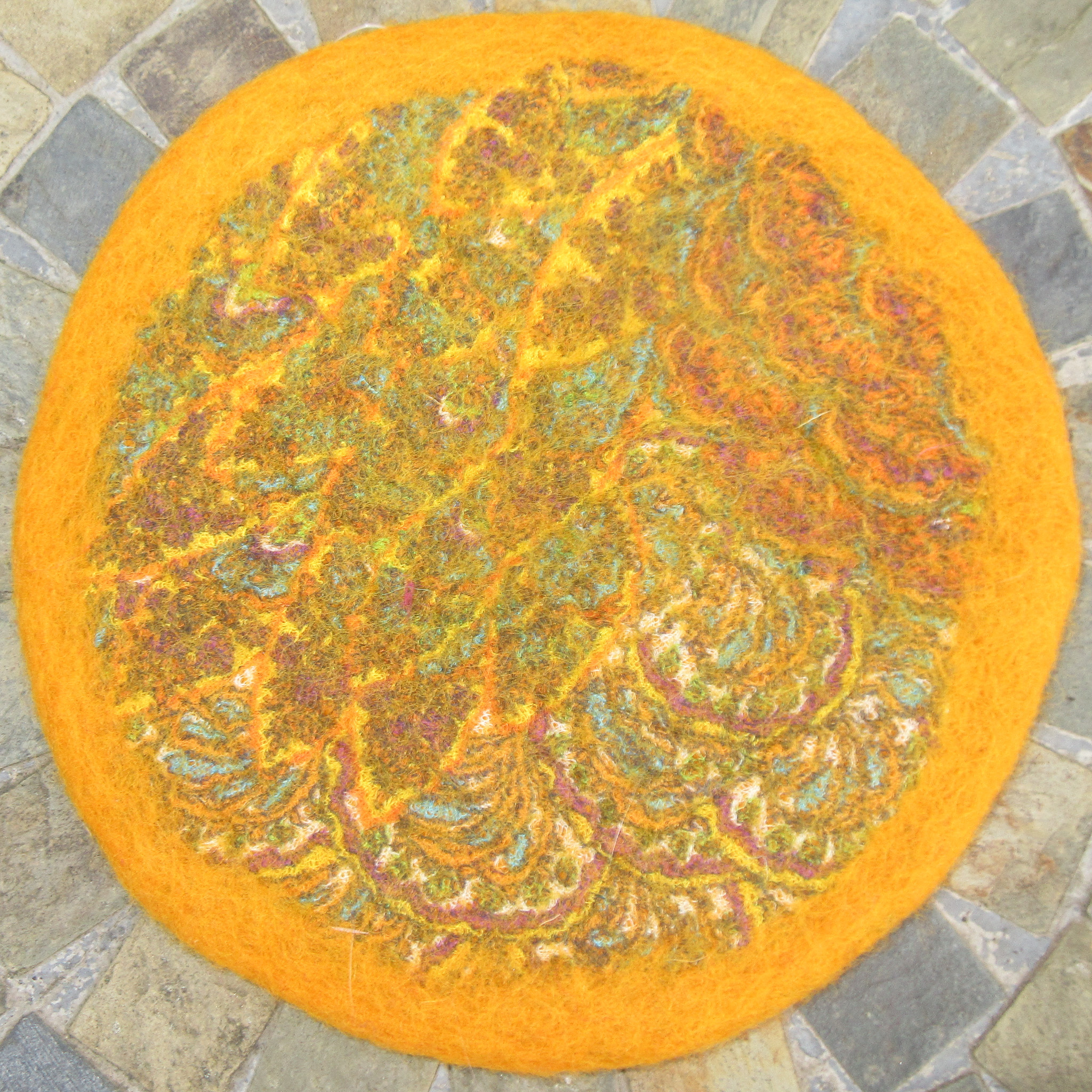 This fair trade trivet is handmade from felted wool infused with cotton from recycled garments to create a lovely new fabric. This trivet has a gold and multicolored on one side, and is gold on the other. It is a unique item so only one is available. It is approximately 8" round and 1/4" thick. It is beautiful and practical, and its purchase helps women in Nepal earn a living wage. Felted wool is a good insulator and is extremely durable. For best results, hand wash in cool water and lay flat to dry.