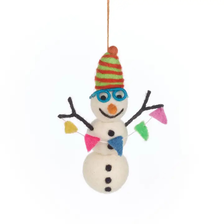 This charming Benedict The Snowman ornament is decked out for a crisp and sunny winter day, in warm hat and spectacles, hanging flags from his tree limb arms. This pretty snowman was made under fair trade working conditions by skilled craftspeople in Nepal. The dimensions are approximately 5"x4" and includes a loop for hanging.
