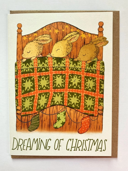 This sweet greeting card features the statement "dreaming of Christmas" and has three rabbits snuggled in bed. The card is blank on the inside. About 6" tall and 5" wide. Envelope included.