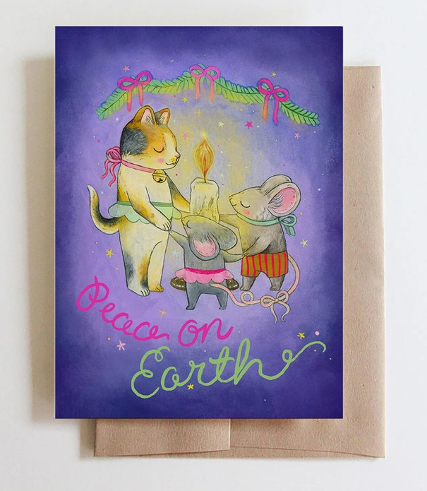 This sweet greeting card features the statement "peace on earth" and displays a cat and mice holding hands around a candle. The card is blank on the inside. About 6" tall and 5" wide. Envelope included.