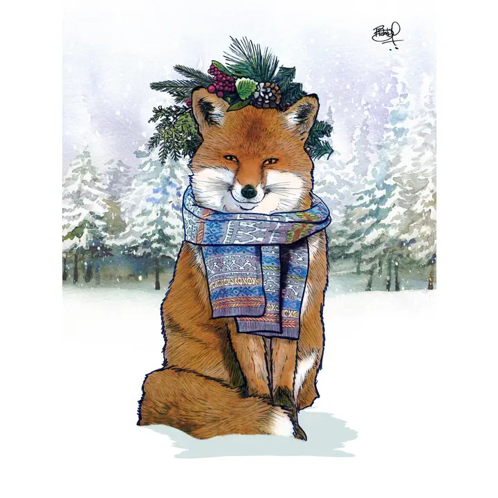 This lovely Winter Fox Greeting card features a fox cozy in a scarf and wearing a wreath crown. About 6" tall and 5" wide. Envelope included.