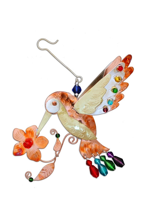 This beautiful metal Jasmine Hummingbird ornament is from Thailand and is made from nickel, copper and brass and adorned with bright beads. This hummingbird looks stunning while getting nectar from a flower. The ornament is about 3" tall and 6" wide, and is double sided. It includes a metal hook for hanging.