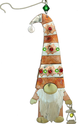 This festive Lantern Gnome ornament is from Thailand and is made from metal and beads. Red and green beads adorn the gnome's hat, and he is carrying a lantern. This ornament is about 5" tall and 2" wide, and includes a metal hook for hanging. Because it is handmade, there may be minor variations from the one pictured. Double sided.