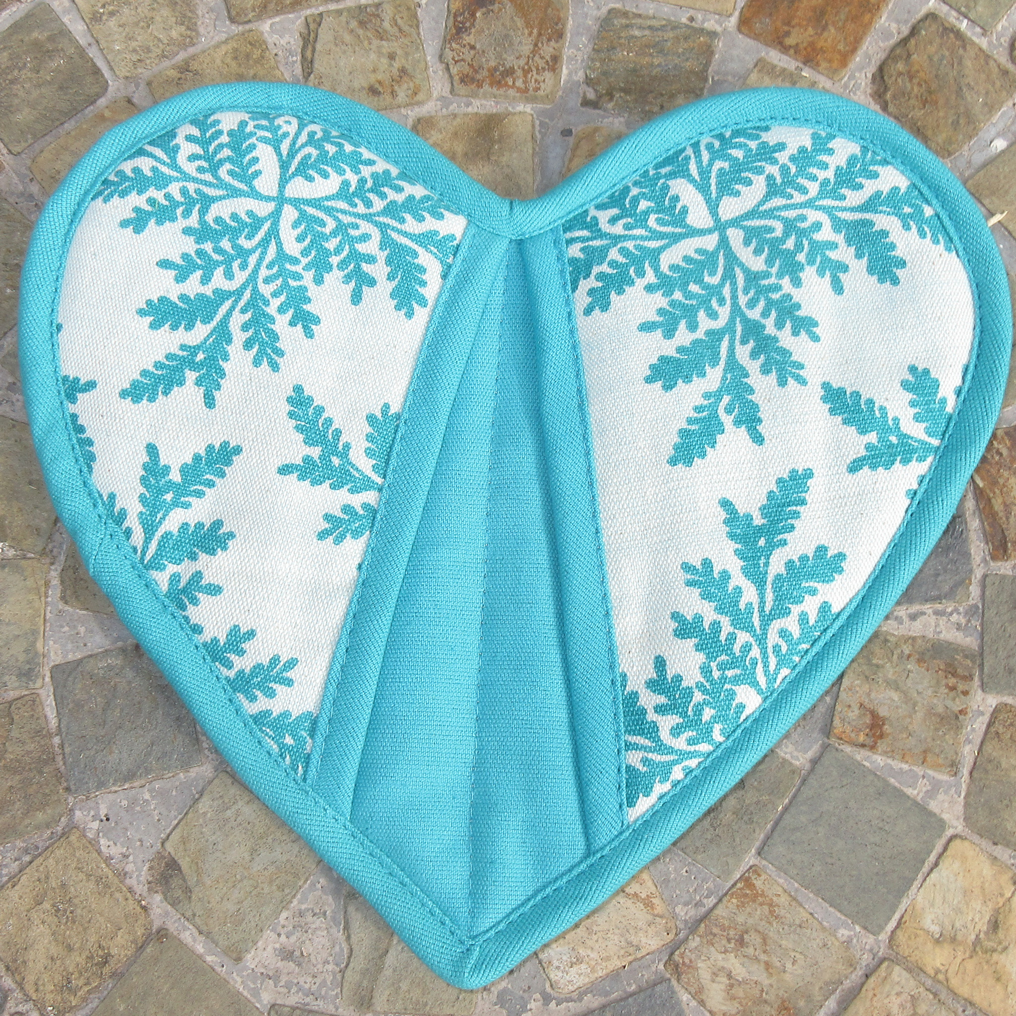 This heart shaped fair trade pot holder is handmade from cotton. This beautiful pot holder has a turquoise and white design featuring two hand pockets to safely retrieve your dish out of the oven. It is approximately 9" x 9". It is beautiful and durable, and its purchase helps women in Nepal earn a living wage. The item is handmade it may vary slightly from the one shown in the image. Hand wash in cool water and lay flat to dry.