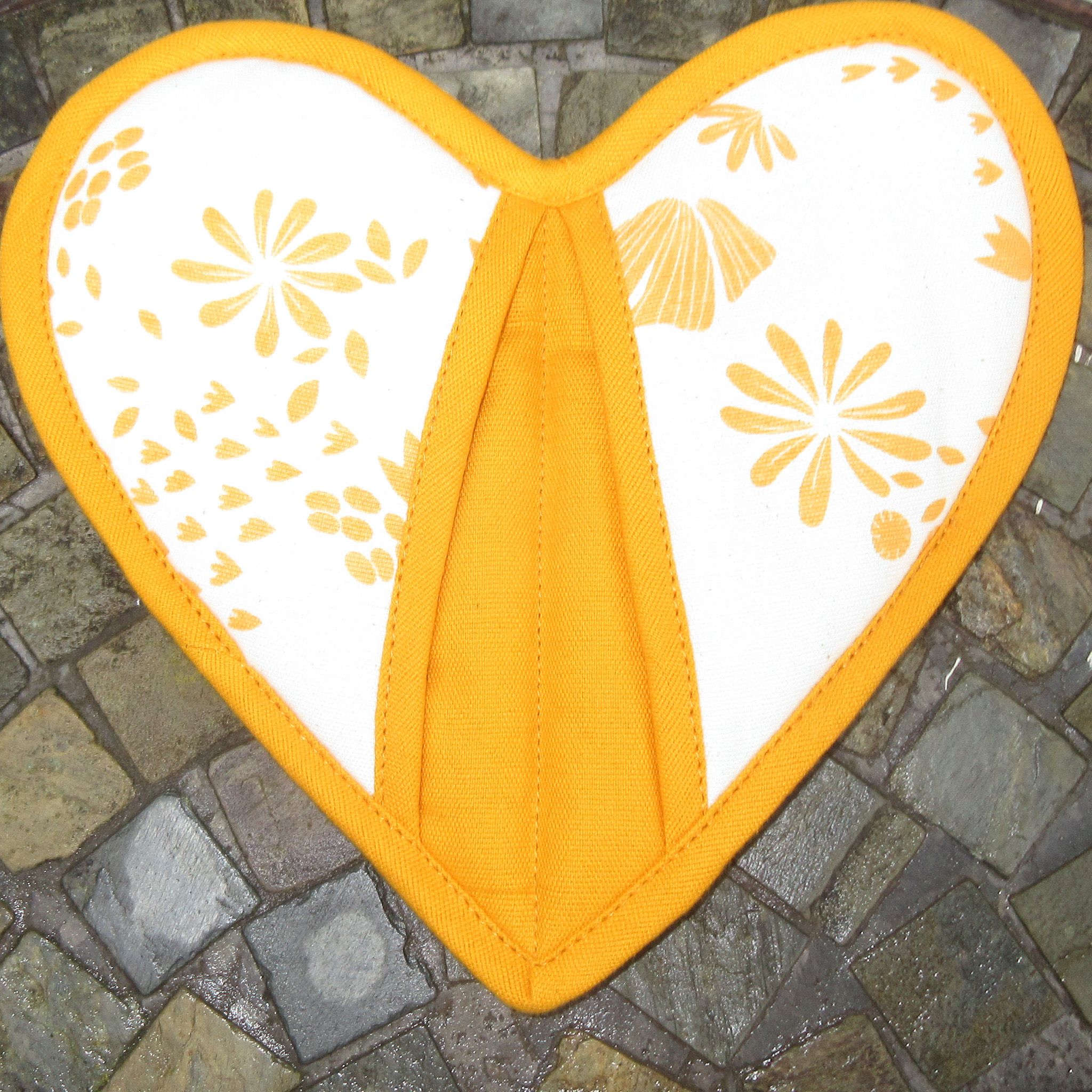 This heart shaped fair trade pot holder is handmade from cotton. This beautiful pot holder has a yellow and white design, featuring two pockets to slide your hand into and grip your dish. It is approximately 9" x 9". It is beautiful and durable, and its purchase helps women in Nepal earn a living wage. The item is handmade it may vary slightly from the one shown in the image. Hand wash in cool water and lay flat to dry.