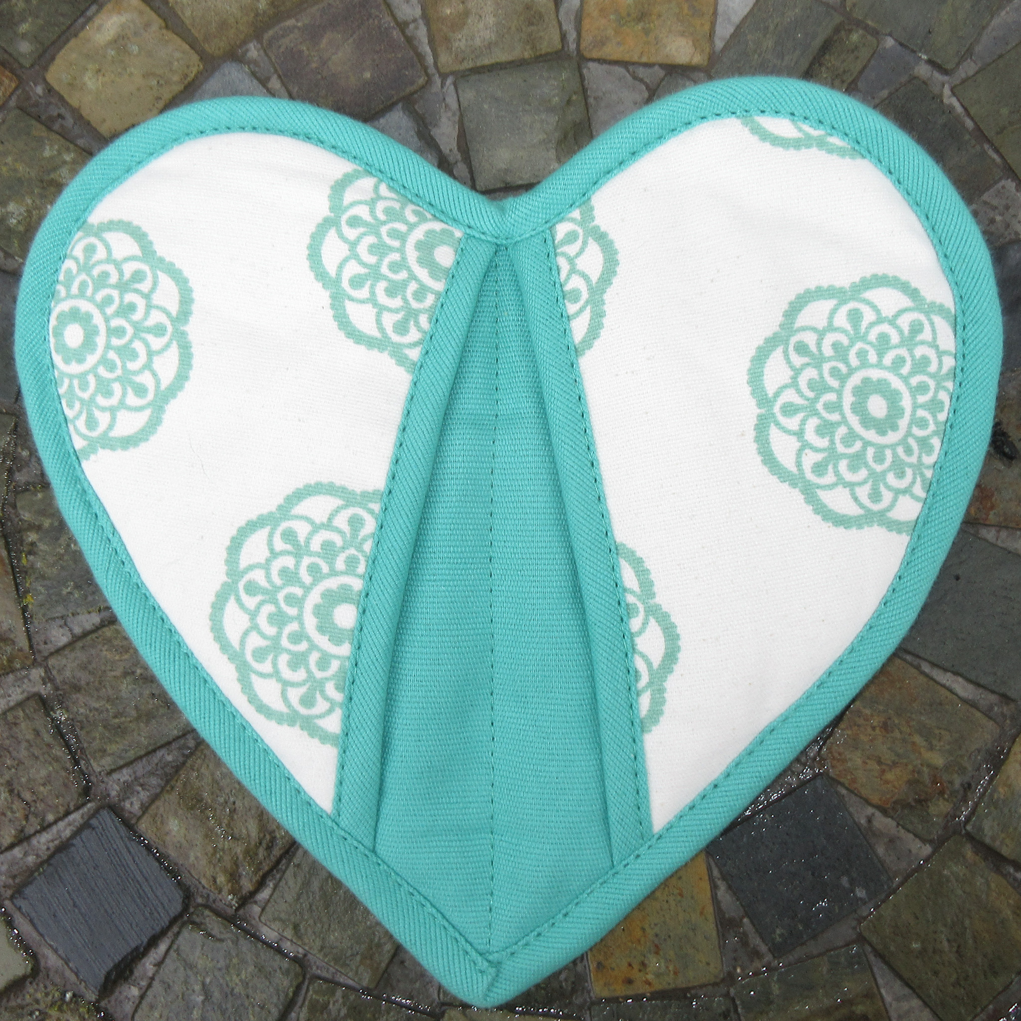 This heart shaped fair trade pot holder is handmade from cotton and felted wool. This beautiful pot holder has a mint and white design featuring two hand pockets to grab your dish out of the oven. It is approximately 9" x 9". It is beautiful and durable, and its purchase helps women in Nepal earn a living wage. The item is handmade it may vary slightly from the one shown in the image. Hand wash in cool water and lay flat to dry.