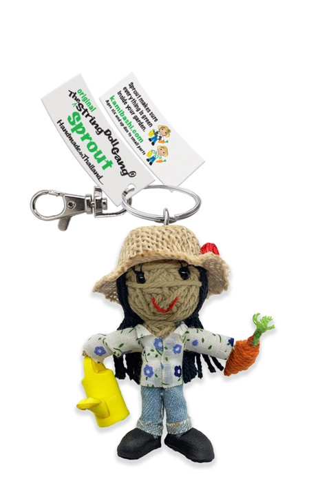 This Sprout doll, primarily made from string, is handmade in a fair trade workshop in Thailand. This industrious gardener has a water pot and fresh veggies from the garden. Sprout has a lobster claw clasp to attach to your keys, backpack, purse, etc. and is about 3" high. This doll serves well as a key chain or charm, and has an attached fabric tag that states "makes sure everything is green inside your garden".