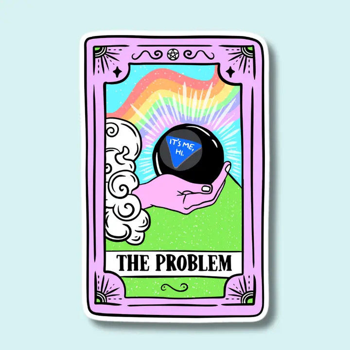 This multi colored eight ball, hand, and rainbow vinyl sticker states "The Problem" and "It's me, hi", putting a playful twist on a Tarot card. This unique sticker has a the roman numeral for the number 3, and would be a charming new addition to your sticker collection. Multi colored with dimensions of approximately 4" height x 3" width. Would make a perfect statement for your rig, waterbottle, laptop, phone, etc. Made in the USA.